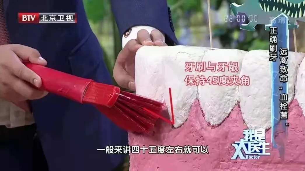 ①把牙刷放在牙齿和牙龈交界的地方,45度角向上倾斜,轻轻刷5到10次,然后向下轻轻刷动几次。