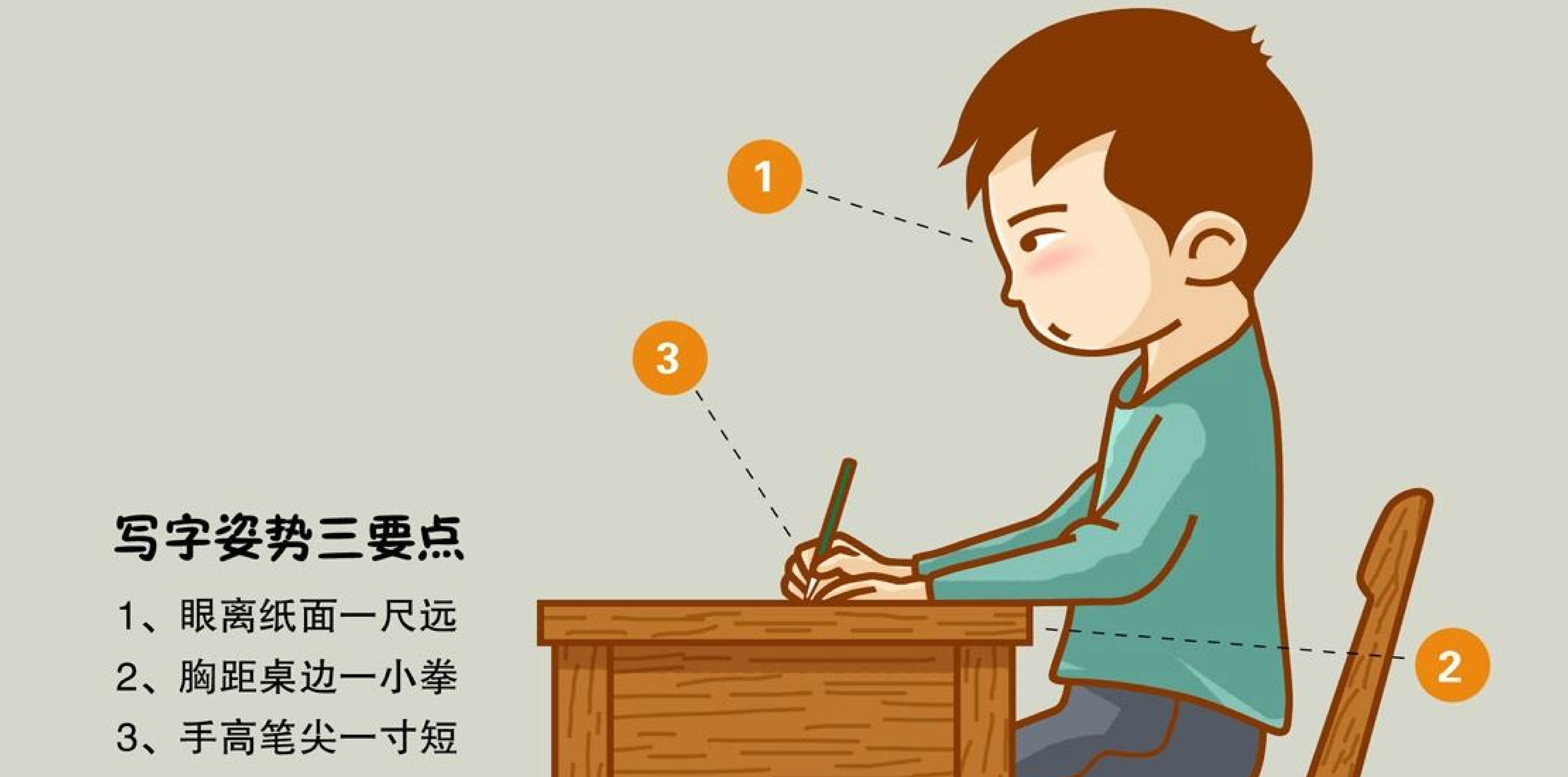 阅读书写应与学校相同。我们耳熟能详的知识点要保持:“一寸一拳一尺”的姿势:握笔手指离笔尖一寸,胸口离桌一拳,书本离眼睛一尺。其次,要保持正确的坐姿,头摆正,肩放平,身体直,稍前倾,两腿并排脚放平。看书时,把书拿起来斜放在桌面上。写字时,拇指和示指捏笔,中指在下托笔,笔杆与桌面成50度角,这样的书写姿势可以保证眼睛能看到笔尖。
